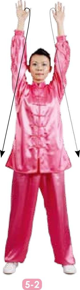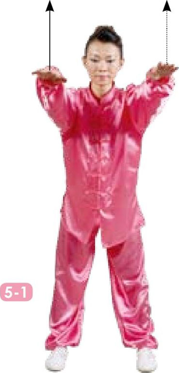 5 两掌沿地面前伸,手臂随之带动上体起立,两臂伸直向上举,掌心向前;目视前方。