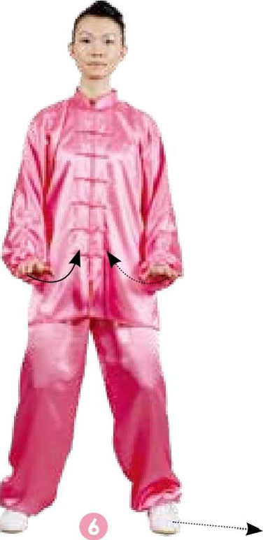 6 重复动作 2~5,一上一下为1遍,共做 6遍。随后,松腰沉髋,重心下移;两腿膝关节微屈,同时两掌向前下按至腹前,掌心向下,指尖向前;目视前方。