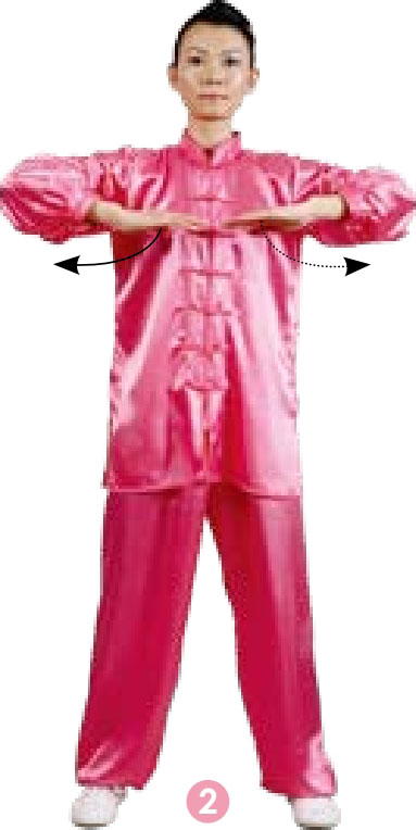 2 两臂外旋至掌心相对,慢慢屈肘,两掌下按至胸前,掌心朝下,指尖相对;目视前方。