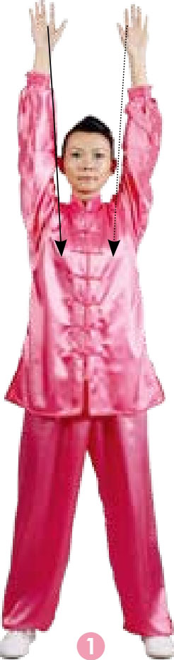 1 两腿挺膝站立,同时两掌指尖向前,手臂向前上方举起,掌心向前,肘关节伸直;目视前方。