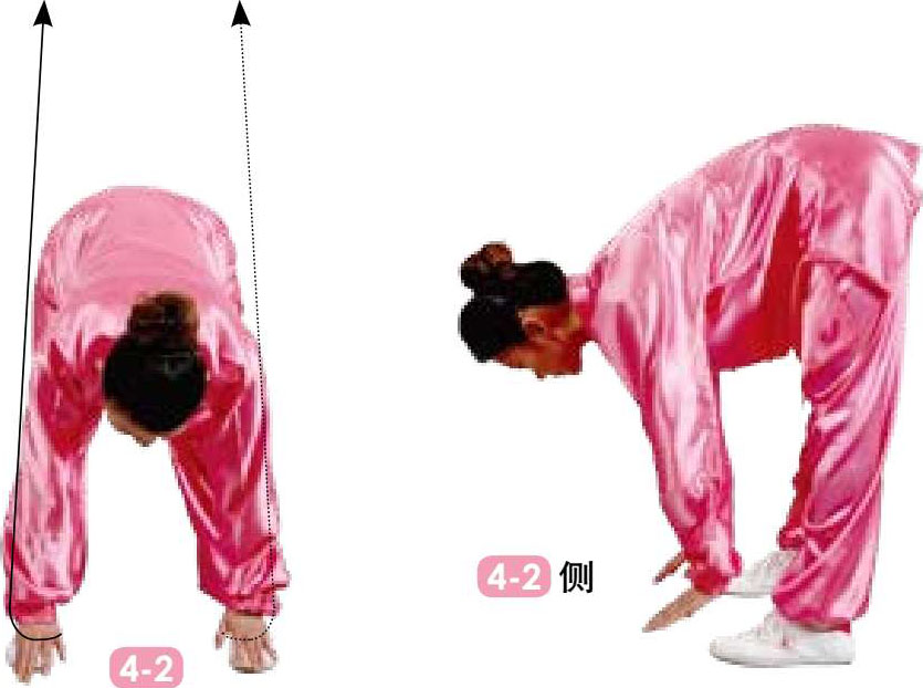 4 两掌由内沿脊柱两侧朝下摩运至臀部,上体随之前俯,两掌继续沿腿后向下摩运,过脚两侧置于脚面,抬头,稍停;目视前下方。