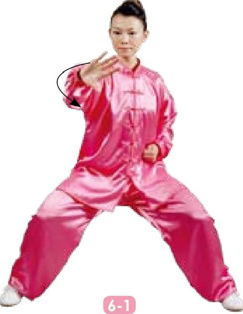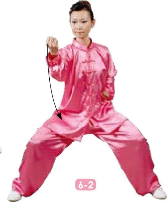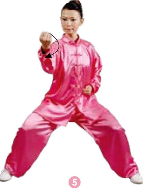 6 右臂内旋,右拳随之变为掌,虎口朝下,目视右掌。右臂外旋,肘屈,同时右掌向右缠绕,变掌心向上后握拳;目视右拳。