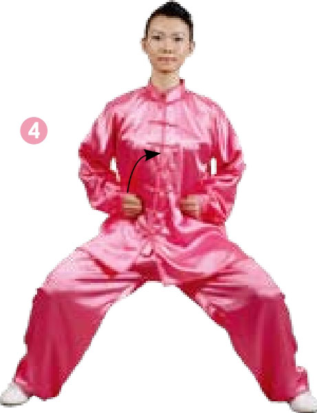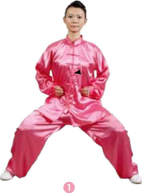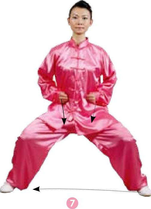 1 身体重心右移,左脚向左侧横跨一步,双腿屈膝、半蹲成马步,同时双手握拳,拳眼朝上;目视前方。