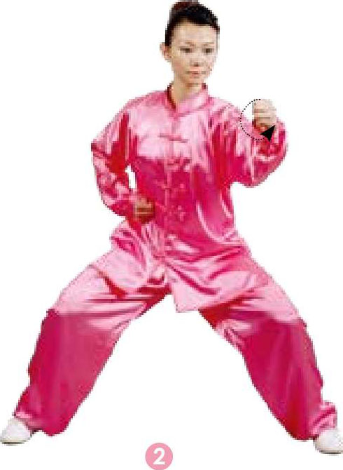 2 左拳缓缓用力向前方冲出,约与肩同高,拳眼朝上;瞪目,目视左拳击出方向。