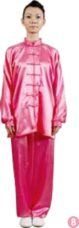 8 动作1~7连做3遍结束后,身体重心右移,左脚随之收回,双脚并步站立,同时两拳变掌,双手自然垂于体侧;目视前方。