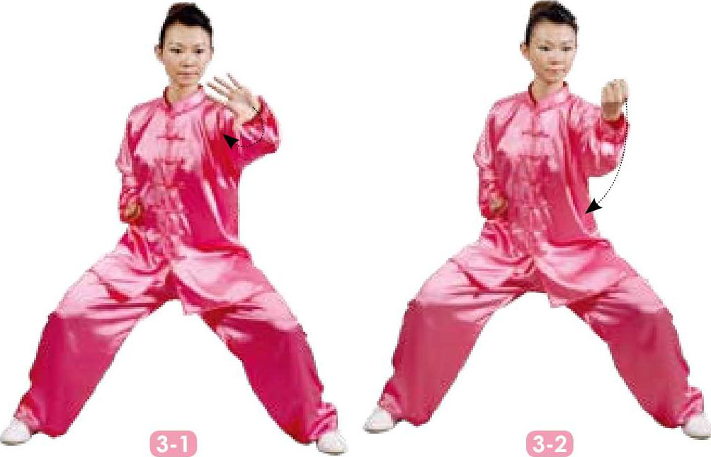 3 左臂内旋,左拳随之变为掌,虎口朝下;目视左掌。左臂外旋,肘屈,同时左掌向左缠绕,变掌心向上后握拳;目视左拳。
