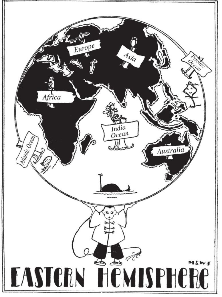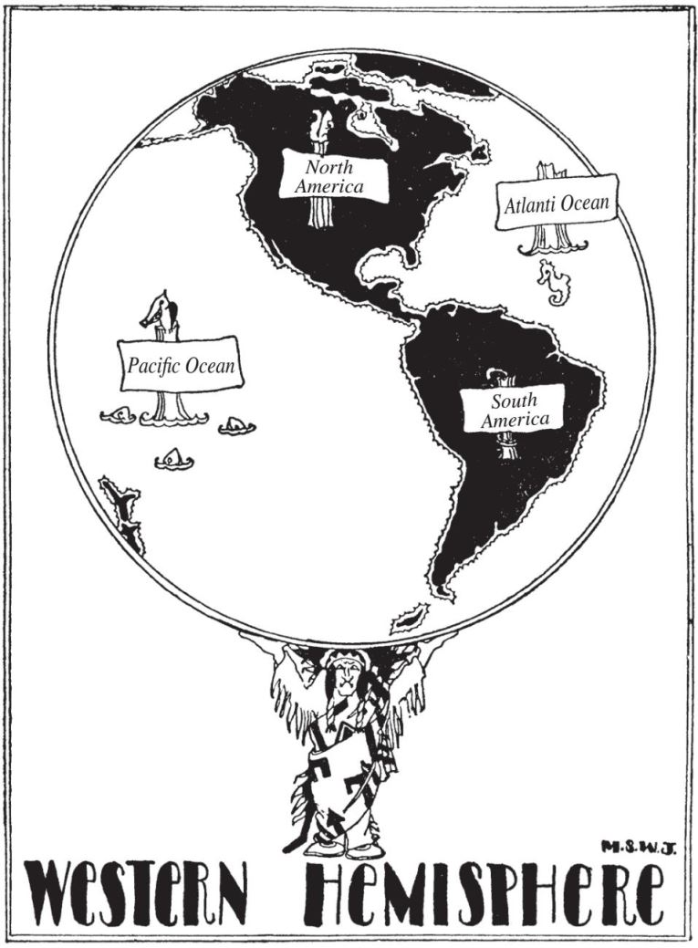 The Atlantic Ocean is on the east side of North and South America. The Pacific Ocean is on the west. The ocean entirely in the Eastern Hemisphere is called “Indian.” No,it is not named for our Indians. At the top of the World is the Arctic Ocean. At the bottom, all around Antarctica, is the Antarctic Ocean. The Arctic and Antarctic Oceans are mostly ice, for it is so cold there the water freezes and stays frozen. If we wanted to put names on the oceans so that a man off in the sky could read them, we would have to stick huge signs in the water, as we can’t paint letters on the ocean.