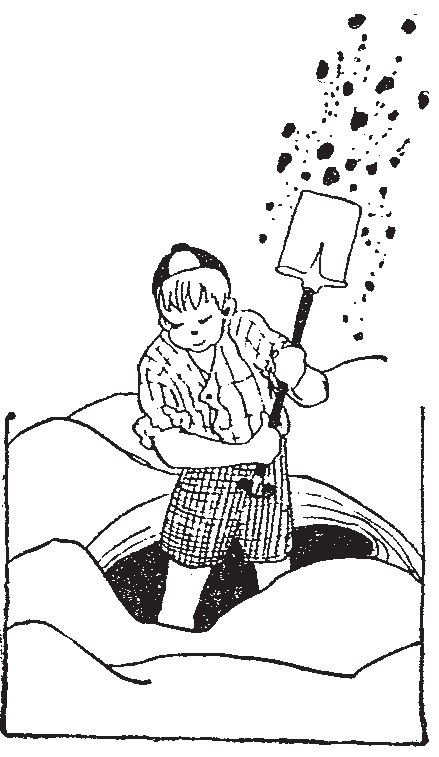 So I made up my mind I’d dig down through the World;down, down, down, till I came through on the other side,and then I’d know. I was a very little boy, you see. With a tin shovel I started a hole in the back yard behind the grapevines, where no one would know what I was doing. I wanted to keep it a secret until I had dug all the way through. Day after day I worked, digging up first soft ground —that was easy—then I got down to solid ground; that was hard.I had a hole which I could stand in up to my waist.