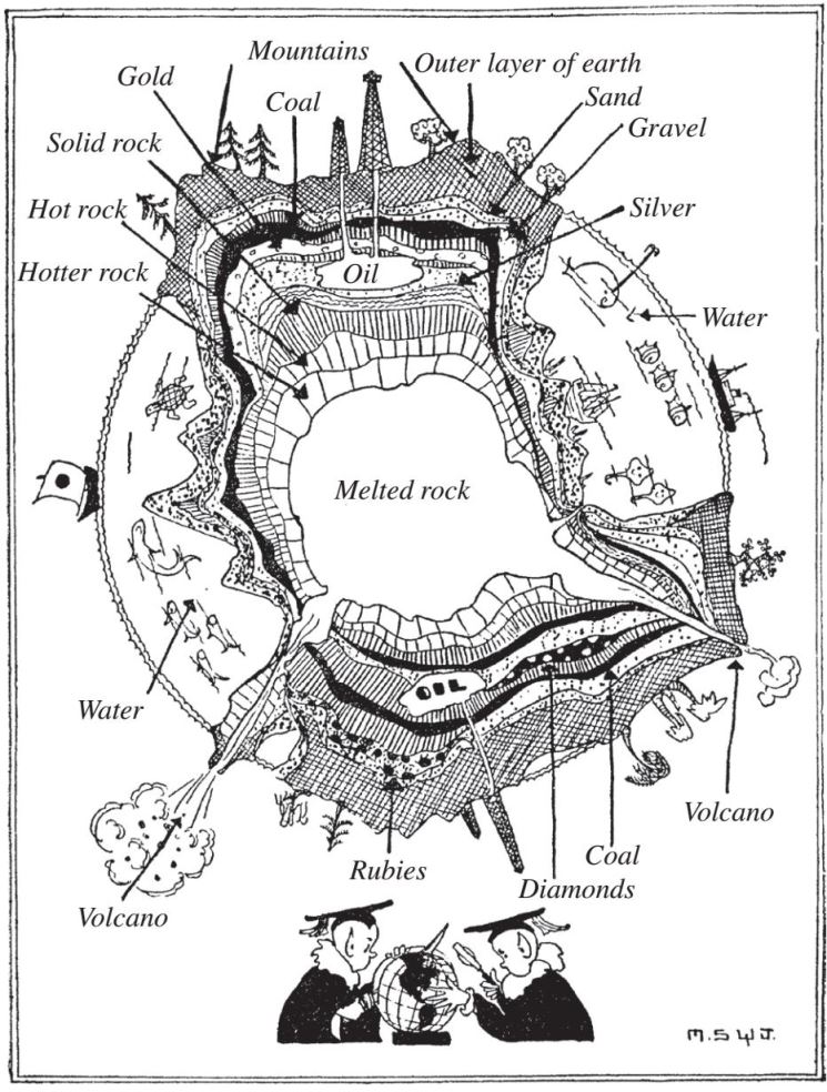 The outside of the World is a crust of rock like the skin of a baked potato over the hot inside. Some of the crust that you go through first is in layers, like layers in a jelly-cake, one layer after another, only these rock layers look as if they were made of sand and shells, or coal or little stones, and that’s what they are made of. If you could cut the World in half as if it were an apple, it might look something like the picture on the next page. We call it a “Cross Section.”