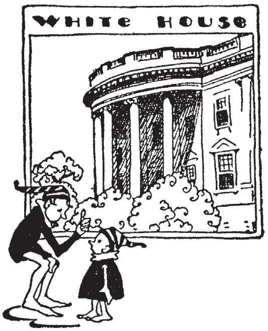 There are many white houses in the country, but next door to the Treasury is a White House that is different from any other, for in this house the President lives. There is a picture of it on the $20 bill. From the back porch of The White House the latest President of the United States can look across his back yard and see a monument to the First President—Washington. The Washington Monument is the highest piece of stone work in the World. It’s like a giant finger, five hundred and fiftyfive feet high. It seemed a mile high, but it is really only about a tenth of a mile high—not even as high as a low mountain. No man has ever been able to build as high as God. Though there is an elevator, I used to run up the stairs, two steps at a time, to the top of the monument—just for fun—to see how quickly I could do it, and whether I could beat the elevator. Boys are like that. They will run a race with anything. I could beat the elevator down by jumping half a dozen steps at a time, but not up. My heart did the beating going up.