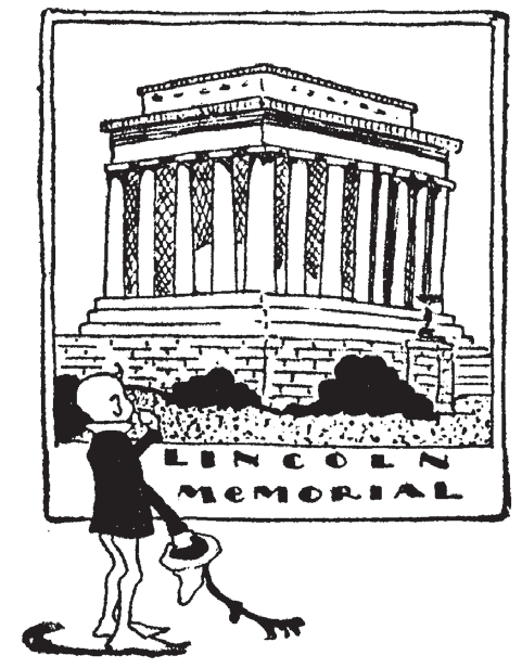There is a long pool of water at the foot of the Washington Monument in which you can see the monument as in a mirror. At the other end of this pool is a marble building with columns all around the four sides. It was built in honor of Abraham Lincoln, the sixteenth President after Washington. It is probably the most thrilling memorial ever built to a human being. There is a picture of Lincoln on the $5 bill and on the other side a picture of his Memorial. Lincoln was born in a tiny house made of logs, so small that the whole house could be put in one room of your home. No boy was ever poorer, or had less money or less chance, and yet he became President of the United States. While he was President two parts of the United States fought a terrible war with each other and almost became un-United, but Lincoln kept the States together. That’s why this beautiful building was built in his honor. The only thing in the building is a statue of Lincoln sitting in a chair. He looks down on the crowds of people who visit him, as if his spirit were inside that figure of stone.