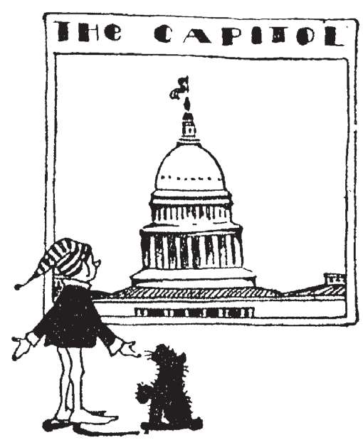 Parades! Soldiers! Bands of music! Flying flags! Some of the greatest parades have passed down a very wide street in Washington called Pennsylvania Avenue, or usually just “The Avenue.” It might be called “Parade Avenue.” It stretches from the Capitol to another building about a mile away that looks like a big bank. This other building is called the Treasury. There is a picture of it on the $10 bill. In the Treasury is kept money of the United States. We write United States with two letters, U. S., and we write the sign for“dollars” with the same two letters, written one on top of the other, with the bottom of the “U” cut off—thus, $.