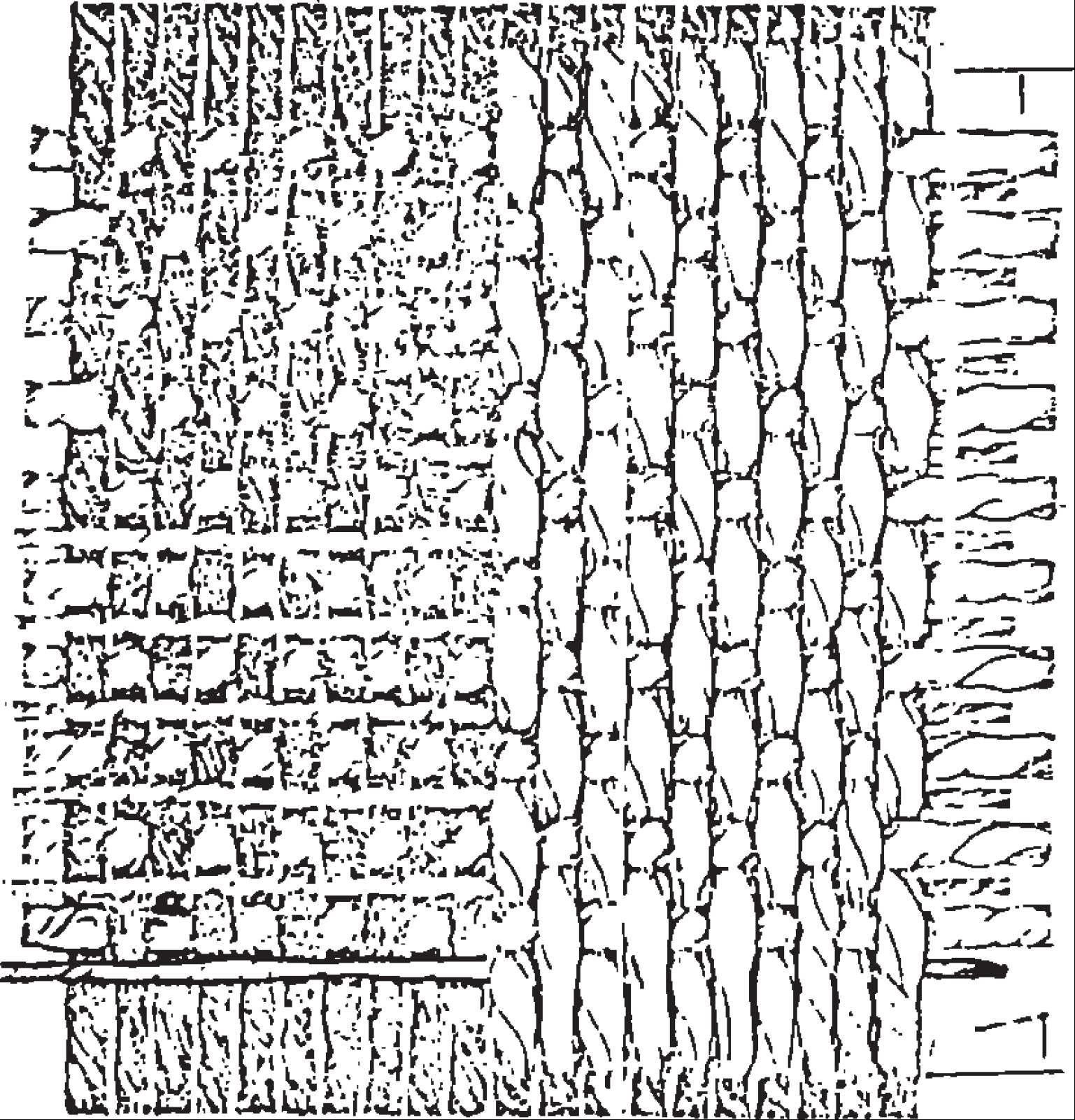 (1) 平纹地暗花绫。包括以下几种:一种是平纹地上斜纹显花,这种组织即以前考古界通常称为“绮”的组织,是对汉代之后绫织技术的直接继承。这种组织的绫被发现极多,约占全部出土绫的80%左右,如各种团窠双珠对龙绫、各种柿蒂绫、人字纹绫(DXM1 ∶ S3)等(图6)。另一种新发现的绫组织,以平纹为地,在花部则由方平或变化方平组织提花与平纹地配合形成变化斜纹,被称为嵌合组织;如方纹绫(DRMIPM2 ∶ S135)的一种花组织就是由平纹与2×2方平配合而成的,而龟甲绫(DRMIPM2 ∶ S62)的显花组织,则是由平纹与2×4的变化方平配合而成的(图7)。这种组织在国内还是首次见于报道。