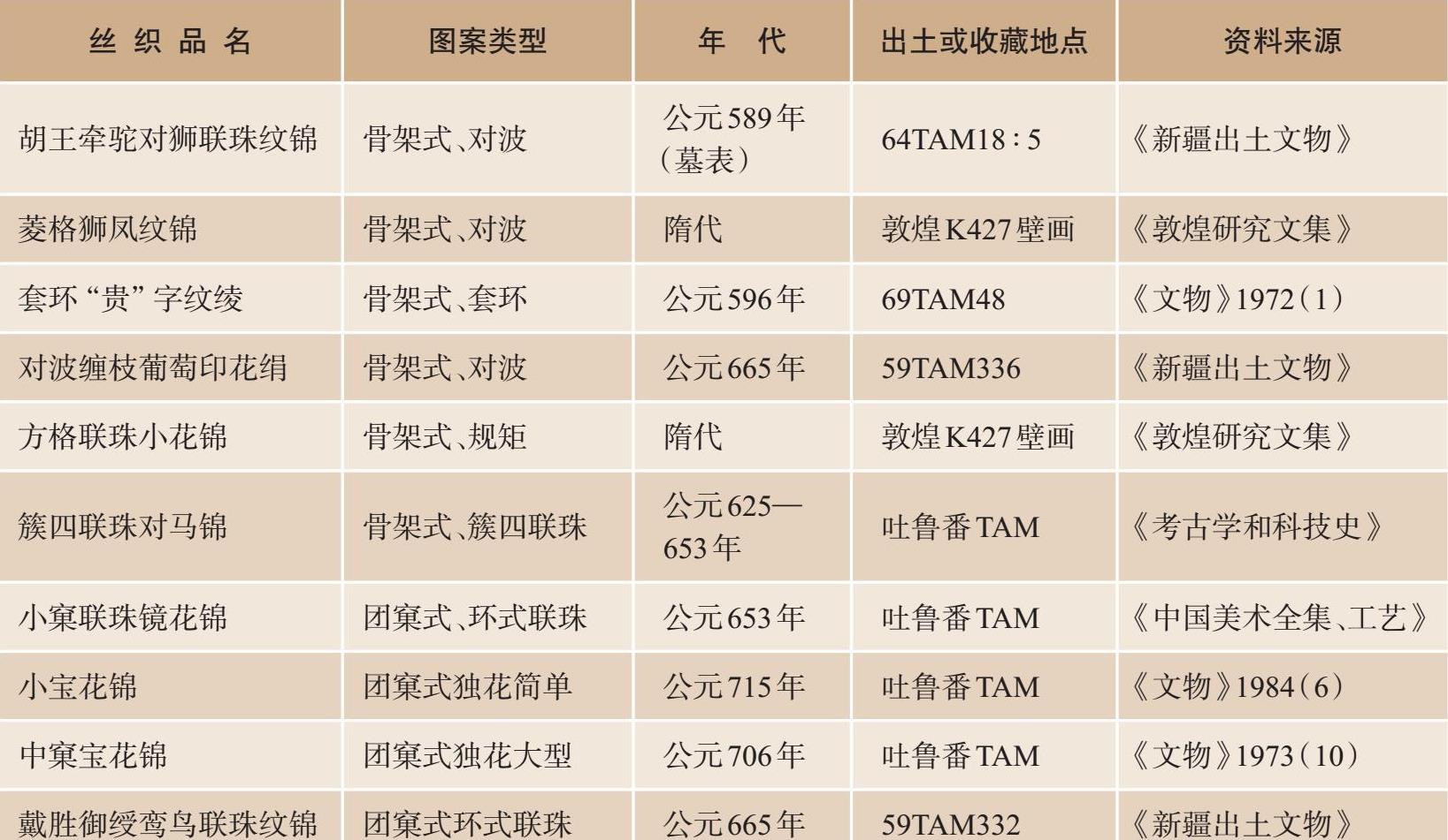 主要流行骨架式排列中的对波型和簇四型等类。主要有三个来源:传统菱形骨架的继承、西亚簇四和团窠的全盘引进以及对波、套环等新型骨架的构成。对波和簇四骨架基本都是来自异域,图案的主题也多是狮、象、驼等中原并不常见的兽类。对波骨架还较多地保留了汉魏以来的一些风格,主题纹样经向对称、经向视觉等也都是中国固有的传统。