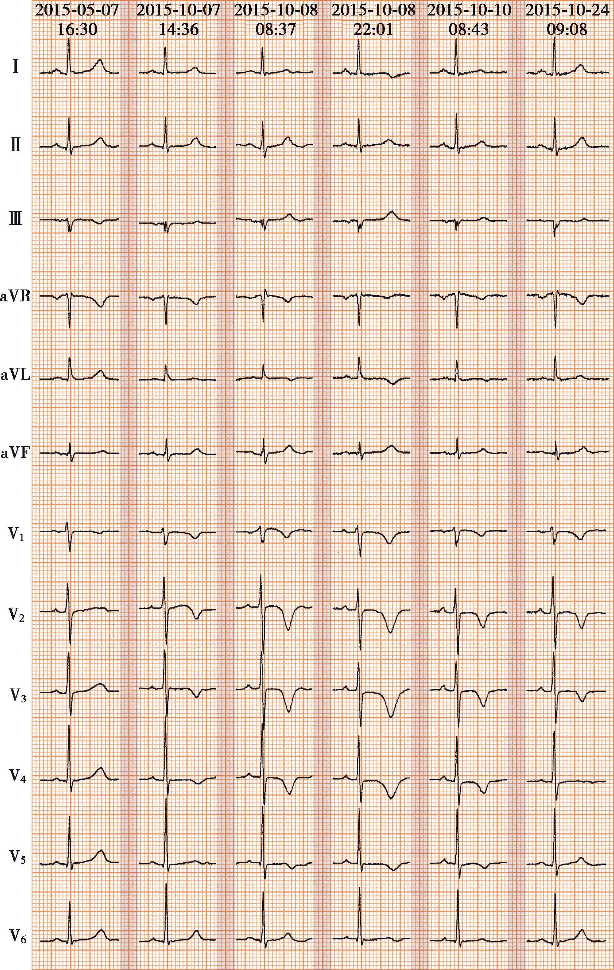 第一份心电图(2015-05-07)是患者发病前的心电图。2015-10-07突发胸闷、胸痛,Tnl:0.29ng/ml,系列心电图可见Ⅰ、aVL、V 1 ~V 6 导联 T 波的动态演变,却始终未出现异常Q波及ST段抬高