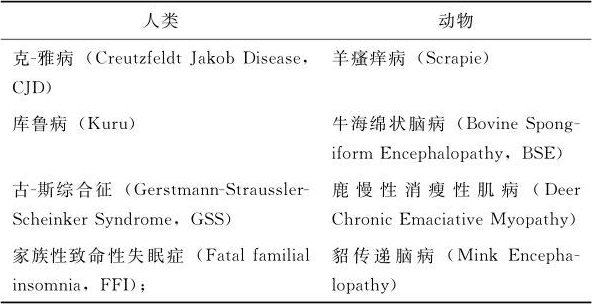 朊蛋白病是一组由变异朊蛋白引起的可传染性、慢性进展性、致死性海绵状脑病,朊蛋白病最早发现于动物,200年后才发现其可在人类发生。已明确在人类和动物的朊蛋白病各有4种(表2-2)。