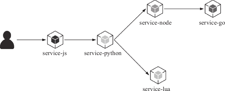 service-js服务是一个由Vue/React实现的前端应用,当用户访问前端Web页面时,用户会看到一个静态页面。当用户点击相应的按钮时,前端页面会通过浏览器异步请求后端service-python服务提供的API接口,service-python调用后端service-lua服务和service-node服务,而service-node服务又会调用service-go服务,最终,所有服务配合来完成用户的请求,并把结果合并处理之后发送给前端浏览器。当前端页面收到请求的响应数据时会渲染出新的页面呈现给用户。