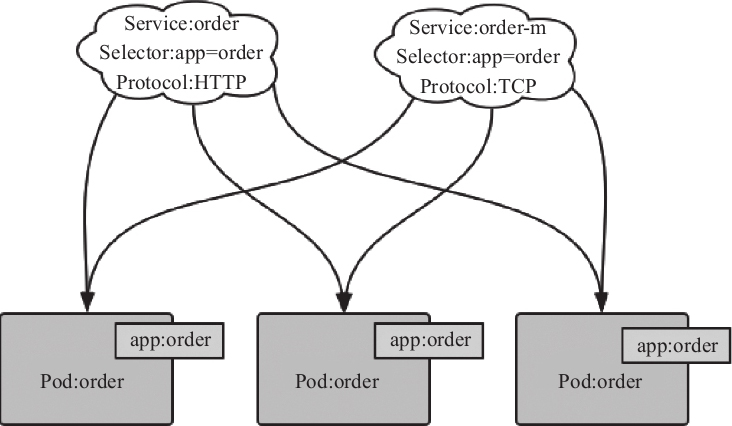 如果一个Pod属于多个Service,多个Service将不能使用同一个端口,并设置多个不同的协议,例如:两个Service选择了相同的后端Pod实例,但是分别使用了HTTP和TCP协议,如图5-2所示。