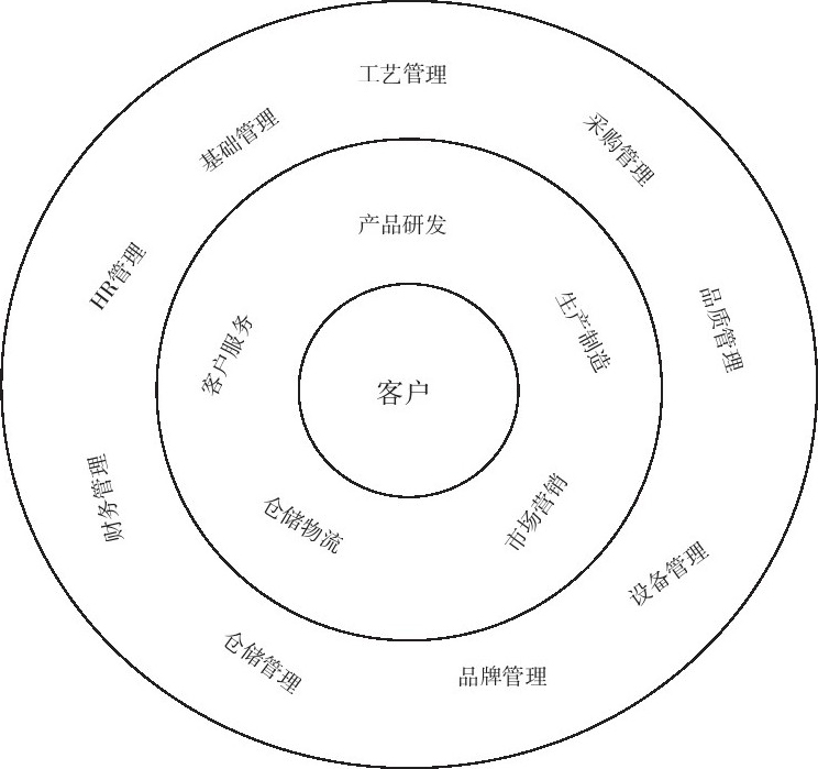 如图1-4所示,不论是产品研发、生产制造、市场营销、仓储物流、客户服务这些在价值链模型当中的基本活动,还是采购管理、品质管理、设备管理、工艺管理、品牌管理、仓储管理、财务管理、HR管理、基础管理等辅助活动,都必须紧紧盯着客户这一核心。