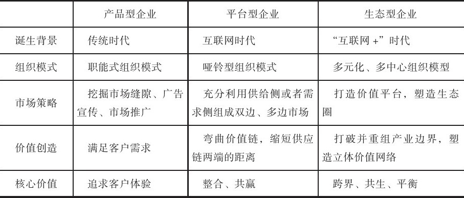 然而,企业要想真正运营好价值链上下游,并成为一家平台型企业又面临诸如平台企业之间价值认同、价值创造评判、利益分配规则等一系列现实的问题,如何才能突破这一瓶颈,构建跨价值链的生态体系就显得非常有必要,生态型企业便因此诞生了。下表是产品型企业、平台型企业及生态型企业对比。