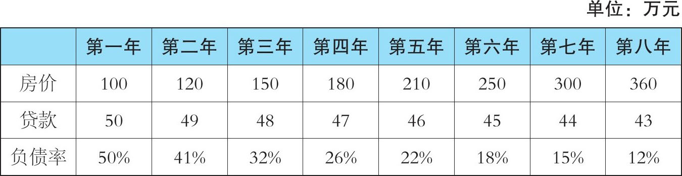 关于第(3)点,让我们看一个展开说明。假如你5年前买了100万元的房子,首付30万元,贷款70万元,那么仅有交易中心过户那一天,你是身负70%负债率的。此后,房屋是不断在升值的。在M2增长的大环境下,任何物资价格都在上涨。而你的贷款在不断归还。假设等额本息贷款还剩下66万元,则5年之后你的负债率是66/300×100%=22%。