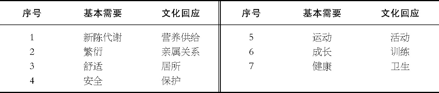 表2-1 马林诺夫斯基的基本需要及其文化回应