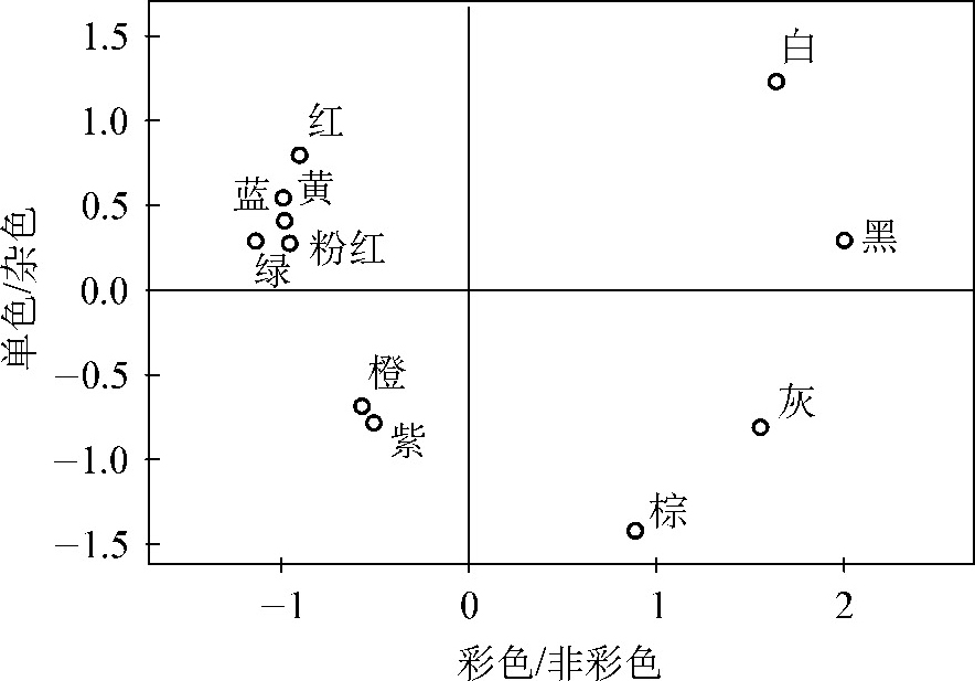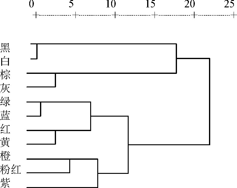 以张积家等人对颜色词概念结构的系列研究为例,将11个基本颜色词按照随机顺序排列并打印在A4纸上,要求被试按照自己的标准对颜色词分类。自由分类的结果是一种开放式材料,通过对其编码,并采用多维标度法(Multi-Dimensional Scaling,MDS)和分层聚类法(Hierarchical Cluster)分析,剖析出对颜色概念分类的标准,揭示出颜色词的概念结构。多维标度法是一种探索性数据分析法。它利用客体的相似性数据,将相似性数据转换成距离数据,建立与客体集合对应的心理空间。衡量指标是压力值(Stress)和RSQ值。压力值表示观察距离与模型距离的一致性,是衡量空间结构与输入数据的拟合优度指标。压力值越小,拟合效果越好。一般来说,大于0.2,不好;0.1~0.2,较好;0.05~0.10,好;0.025~0.05,非常好;0.00~0.025,完全适配。RSQ是距离变异中可以由模型距离解释的百分比,越接近1越好(陈正昌,程炳林,陈新丰,2005;靖新巧,赵守盈,2008)。用多维标度法将研究数据转换成距离矩阵后,得到语义空间图和各个颜色词在不同维度上的坐标值,再根据坐标值作分层聚类分析,得到聚类分析树形图(Pollio,et al.,2005;揭水平,2009)。例如,王娟、张积家和林娜(2010)得到的纳日人(摩梭人)基本颜色词的语义空间如图3-3所示,聚类分析树形图如图3-4所示。