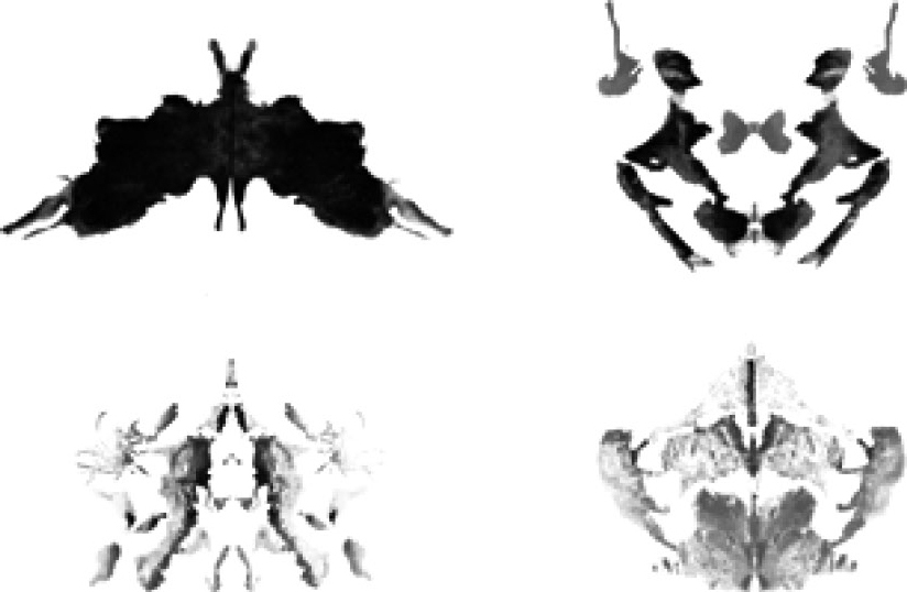 罗夏克墨迹测验(Rorschach Ink Blot Test)是由瑞士精神病学家罗夏克(H. Rorschach,1884—1922)1921年在临床上最早使用的。起初是用带有墨渍的图片测试病人,后来,从中选出10张图组成墨迹测验(图3-1)。每张图的墨迹形状不同,有5张是黑白的(1、 4、 5、 6、 7),各张的墨色深浅不一;另有2张是黑白的和鲜红的(2、 3);其余3张是淡彩色的(8、9、10)。在每张图片中,墨迹都是形状对称的。