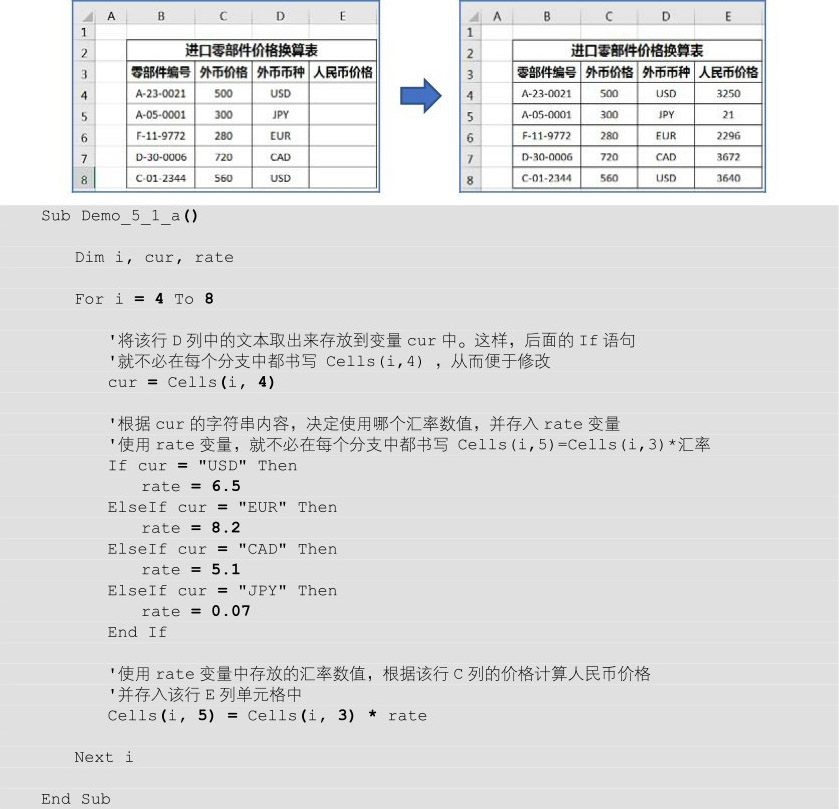 案例5-1: 在图5.3左侧所示的工作表中存有多个商品的进口价格,但是各自采用不同的货币单位计价。请编写一个VBA程序,将所有价格都换算为人民币价格,具体换算汇率为:1USD=6.5RMB、1EUR=8.2 RMB、1CAD=5.1RMB、1JPY=0.07RMB。预期效果如图5.3右侧的表格所示。