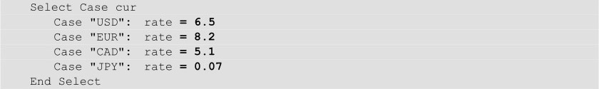 在参考答案中,我们使用了一个多分支If结构对每行数据的币种进行判断。如果这行D列单元格中的字符串等于“USD”,就让变量rate等于6.5;否则如果该行D列等于“EUR”,就让变量rate等于8.2,以此类推。当然,也可以使用Select…Case结构代替If … ElseIf结构,代码如下:
