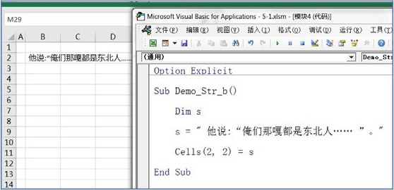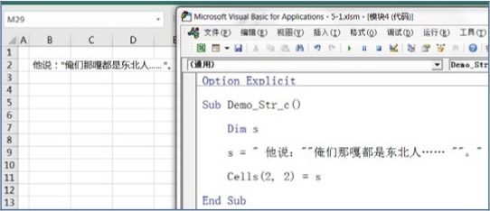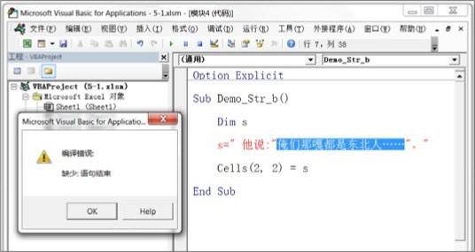 引发语法错误的原因在于,当VBA看到等号后面第一个“"”时,意识到从这里开始将是一个字符串,“"”就是该字符串的起点。当看到冒号后面的“"”时,根据语法,VBA 认为这就是该字符串的结束位置,也就是说,需要赋值给变量 s的字符串就是“他说:”。既然如此,赋值语句到此就理应结束,可事实却是第二个“"”后面还有很多内容,即“俺们……”。因此VBA认为这行代码在第二个“"”后面缺少一个语句结束标识(比如可以将两个语句分隔开的冒号),提示出错。