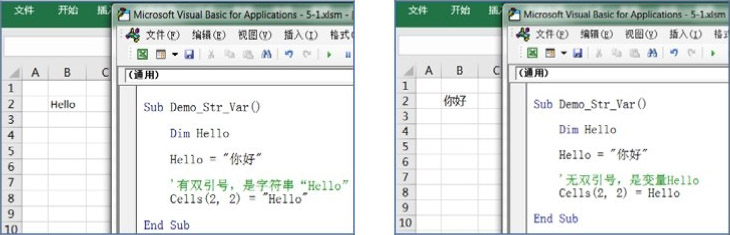 但是在图5.4右边的程序中,最后一行代码没有在Hello两边套上双引号,因此VBA不会把它当作一个字符串,而是把它当作一个普通变量,就如前面所举的例子那样。巧合的是,在这个程序的第一行就定义了一个名为 Hello 的变量,并在第二行中给它赋值为“你好”这个字符串。所以这句代码的含义就是:将变量Hello的值赋予B2单元格,也就是在B2单元格中显示“你好”。