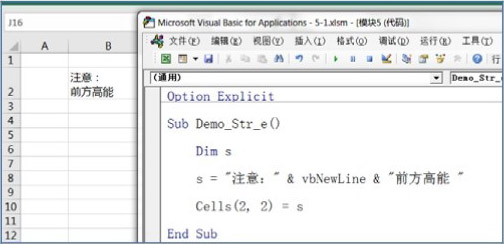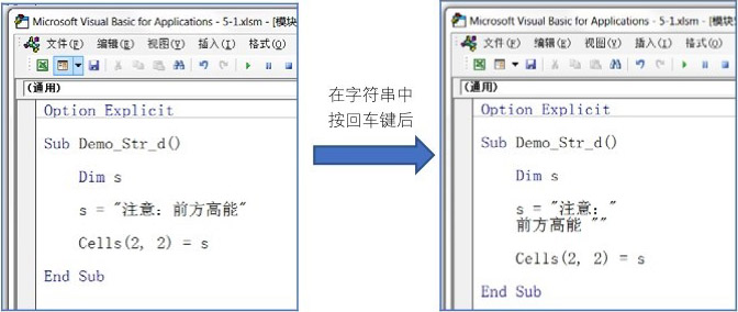 在图 5.8 中,由于VBA要求字符串不能跨行书写,所以自动为字符串的第一行补足引号,使其成为一个完整的字符串赋值语句;同时在第二行中间的合适位置也补足了引号,从而使这行看上去像一个“过程调用”语句
