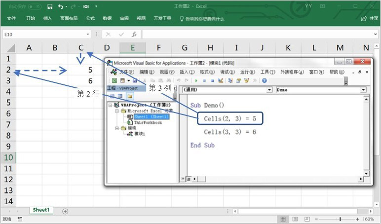 理解了VBA程序的基本结构,我们接下来就仔细研究一下这个示例程序中的代码“Cells(2,3)=5”到底是什么意思。