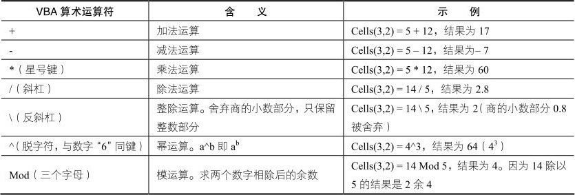 在 VBA 中编写算术运算语句,与数学中列算式的方法几乎相同,无非就是加、减、乘、除各种符号的使用。只不过受电脑键盘设计的限制,有些符号的写法略有不同,如表1-1所示。