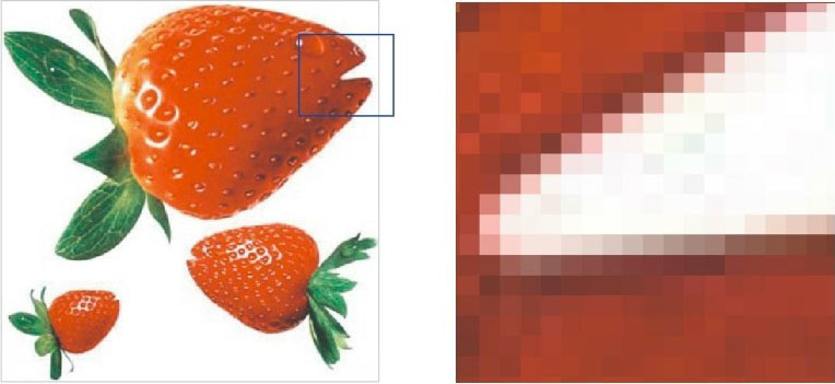 若对位图图像进行较大倍数的放大显示或以低于创建时的分辨率来打印,图像将会失真,边缘将会出现锯齿状,如图1-10所示。若要输出高品质的位图图像,在进行图像设计之前,就应该设置分辨率,但文件会比较大,运转速度会相应地降低。