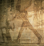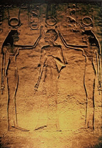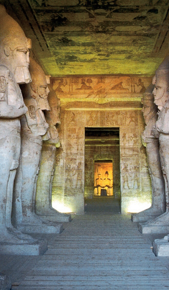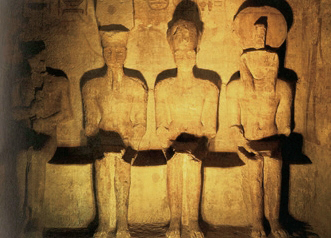 最后的圣堂(中央神龛)距入口处约65米,在山的心脏部位,面积仅4米×7米。正面墙前端坐着4尊坐像:阿蒙—瑞、拉美西斯二世、海尔马夫斯和卜塔(图1-043)。就在这里,拉美西斯二世把自己摆到与众神并列的位置,达到神格化的顶峰。也许是因为这里紧靠苏丹边境,远离了埃及祭司们的势力范围,法老可以随心所欲地抬高自己的形象。与神庙大门外的雕像不同,这4尊雕像手法十分写实,毫不夸张,可能是为了让法老神化得真实可信。这里也是神庙最为神奇之处:每年春分和秋分这两天(据说,一天是法老的生日,另一天是他登基的日子),初升的太阳光会穿过从入口到圣堂65米的距离,直接照到4尊雕像中的3尊,时间长达5分钟。最左边的卜塔神雕像则永远处于黑暗之中(他是黑暗之神)。这一天文知识的精确运用,无疑大大增强了神化法老的威力。