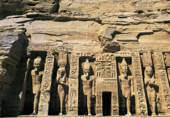 这座哈托尔女神庙也是一座以雕塑为主体的纪念性综合体。其构思和型制也是有所突破的。它破天荒地把2尊尼菲塔丽雕像以同样的尺寸(高10米)和4尊拉美西斯二世雕像并立在神庙的正立面。雕像之间,分别以刻有美丽象形文字的护墙所隔开。按照传统的做法,室外大型作品中,王后的雕像只能以小得多的尺寸安置在法老雕像的腿边或腿间。这座神庙也可以说在某种程度上提高了女权。当然,这也是有限的,因为王后只有2尊雕像,而法老雕像却有4尊。