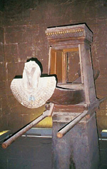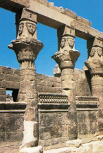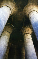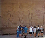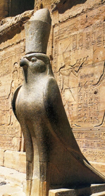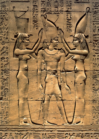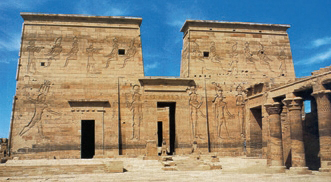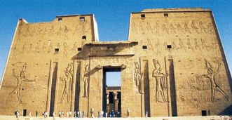 位于原上埃及都城——伊德富的鹰神庙(图1-047),是希腊人统治的托勒密王朝于公元前30年建成, 也是古埃及晚期保存最完整、规模最大的一座神庙。它完美地体现了传统的规范,重复着历经两千年的程式,而缺乏创造性的时代紧迫感。但是,在荷鲁斯鹰神庙上却看到了浮雕艺术更娴熟、更富变化的表现手法。艺术家似乎也更有信心。和菲莱岛上的伊西斯女神庙(图1-048、图1-049)、丹特拉的哈托尔女神庙、考姆翁布的双神庙等一样,建筑与雕塑都更精致华丽,但已失去当年气吞山河的宏大气势。门前没有了高高耸立的方尖碑、深远的斯芬克司神道,和规模惊人的法老巨像。鹰神庙只在第一塔门入口和多柱厅入口两侧各安放一尊高约2米、头戴王冠的鹰神黑花岗岩雕像,神庙的塔门外墙和后墙上的大型浮雕却是极精彩的(图1-050、图1-051)。后墙上排列着一系列神祇和法老浮雕像,高度几近8米。一个个都刻出深剜的外轮廓,其精准的功力令人叹服,没有丝毫的拖泥带水、含糊不清的地方。这种处理保证了它们在逆光、远看的条件下仍有足够的清晰度。这些人物的头部、胸部、骨盆的过渡衔接都很自然巧妙。庙内墙面上也随处可见浮雕精品(图1-052~图1-055)。古埃及两千多年前的社会生活,神明、法老和臣民,都被定格在坚硬的岩石中,超越了时光。