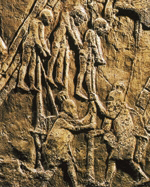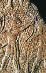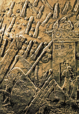 亚述宫殿中的浮雕,主题多为战争、狩猎、大型庆典及宗教仪式(图2-014)。著名的猎狮浮雕即出于此(图2-015、图2-016)。在西拿基立的尼尼微宫殿仪式室中,四面墙上伸展着近30米长的全景式浮雕,这是西拿基立于公元前701年征服犹太要塞莱基一战的真实写照。攻城、献俘、屠杀,血淋林的恐怖场面令人毛骨悚然(图2-017~图2-019)。