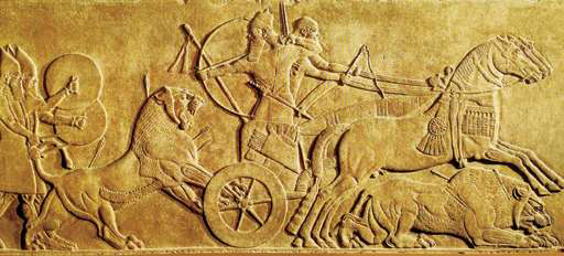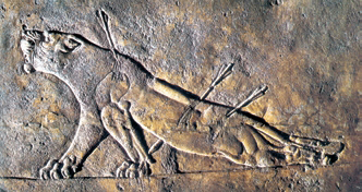 看得出来,亚述浮雕受到古埃及浮雕风格的影响,有很强的装饰性,擅长处理侧面形象。但他们表现出了更强的能力,突破了古埃及浮雕的水平。首先,亚述浮雕虽然有许多是单摆并列式的构图,但也有许多作品,构图更加自由,表现人、动物与环境的关系更富于变化,例如很多战争攻城场面,变化就非常丰富。其次,许多形象已不再拘泥于正侧面的处理。正面、半侧面到正侧面的过渡、旋转和扭曲都安排得妥帖舒服,形象轮廓的压缩关系也很合理,又能保持整体的概括深入、轮廓的清晰准确和形象的力度。再次,对个体形象的刻画,亚述浮雕也较少程式化的痕迹,更加个性化。尤其是众多猎狮浮雕中的狮子形象最为出色。狮子的勇猛扑杀和挣扎,极其生动,写实有力,有些充满了悲壮的魅力。这都是古埃及浮雕所未曾达到的。