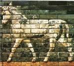 伊斯塔门浮雕所采用的单摆并列正侧面形象,不强调空间透视的艺术手法,极适合于建筑装饰。这可以从埃及、亚述等处得到传承。上面覆以琉璃釉面,便有了相当的耐久性和独特的鲜亮性。以多种动物的局部,综合出一种神奇怪异的圣兽形象以代表巴比伦主神玛尔杜克,这种浪漫的手法更是埃及和亚述艺术家所惯用的,由巴比伦雕塑家继承下来,也不足为奇。在这种种因素作用之下,这件足以令世人震惊的伟大作品产生了。当然,不能忘了创作的主持者尼布甲尼撒二世。他在一篇石板铭文中说道:“我用沥青和砖块在地下水位处垫下基础,用蓝色石头将它建起。我在门上放上了野牛和凶残的龙作为装饰,使之豪华壮丽,人们注视它们时,心中都充满惊异之情。”