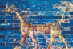 由北进入伊斯塔门的大道,两旁墙壁下面各有一条琉璃砖浮雕带,其上单摆并列着120头昂首阔步行进的雄狮,它们象征着女神伊斯塔(图2-025)。这条典礼大道长200米,地面最上层由一米见方的白石板铺就,最下面是泥沙和卵石,中间层是砖和沥青,宽度超过20米。在巴比伦的新年(今3~4月)为期11天的庆典上,国王到城外的庙宇祈福,并举行繁育典礼。最后一天,国王与玛尔杜克神的雕像分别坐在战车上,后面跟着祭司与其他神像,沿着典礼大道浩浩荡荡向前行进,穿过富丽堂皇的伊斯塔门,重新回到城里,以此保证新的一年富足丰产,以及王位的稳定。