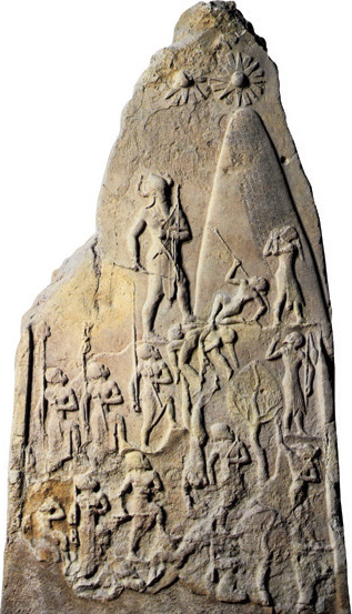 必须提到杰出的浮雕纪念碑纳拉姆·辛石碑,这件伟大的作品是公元前2254年~前2218年 ,为纪念国王阿卡戴战胜扎格罗斯山北坡的卢卢比人而建的(图2-028)。它后来被埃兰的一位国王作为战利品带到苏萨。整件作品构图主次分明,富有变化,人物姿态神情生动。体量高大的国王手持弓箭,屹立在山上,在胜利星光照耀下,接受战败者的投降。山坡上有登山的两层战士行列,还生长着树木。