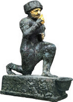 在两河地区历史中,尤其是在公元前10世纪~前6世纪这三四百年间,依附于建筑的浮雕艺术空前繁荣的同时,小型的圆雕作品也很多。例如马利出土,公元前三千纪的埃比希尔王雕像、伊什图皮鲁姆统领雕像、手持水罐的女神像、苏美尔王后像等;乌尔王陵出土,公元前2600年的黄金天青石的公羊立像(图2-001)、公元前2100年的古地亚王子雕像、公元前9世纪的亚述纳西尔帕二世立像(图2-026)、公元前18世纪的汉谟拉比国王青铜单腿跪像(图2-027)等。然而,独立存在的雕塑纪念碑,特别是大型圆雕作品却很少。