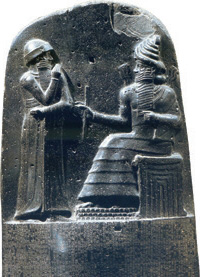 高2.25米的汉谟拉比法典石碑是公元前18世纪的作品,其造型与构图手法是当时常用于界碑的(图2-029)。它堪称图文并茂。上部描绘古巴比伦汉谟拉比国王向太阳神沙马什祈祷,神情庄重。二人半侧面的躯干与正侧面的头部衔接自然,侧面形象严谨准确,体现了“君权神授”的主题。石碑下部用阿卡德文字镌刻了在王国内审判过的近三百宗案件,正文共282字,成为现存最完整的一部古代法典。