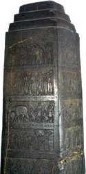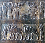 公元前9世纪,亚述国王沙尔马尼瑟三世在自己的尼姆鲁德王宫里,竖起了高2米的黑色大理石“方尖碑”,轮廓类似高耸的塔庙(图2-031)。四面各刻有五层浮雕,再现了臣服民族向征服者进贡大象、犀牛、骆驼、狮子和牡鹿的场面(图2-032)。单摆并列式的形象简洁准确,神姿自然生动。下面有铭文。这座“方尖碑”使人联想起奉献给太阳神,歌颂法老的古埃及方尖碑。此二者除了年代相距一千年外,区别还在于:古埃及的方尖碑是真正的方尖碑,顶部呈金字塔形;沙尔马尼瑟三世的“方尖碑”顶部则为阶梯形的平顶。古埃及的方尖碑高度一般都有十几米,高者近30米;而沙尔马尼瑟三世的却仅高2米。耸立在神庙门前的古埃及方尖碑,碑尖镏金,碑身刻着象形文字,显得神秘莫测;而放置在王宫中的沙尔马尼瑟三世的“方尖碑”却周刻浮雕画面,仅在站立者的视平线上下,贴近观者,十分通俗易懂。