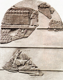 公元前2450年的鹰碑也属于浮雕纪念碑,它与古埃及的大金字塔同时期(图2-030)。碑上用浮雕详尽地刻着建设城市和战争打斗的场面。有在盾牌保护下进攻的成队士兵,也有成堆的正在被鹰隼啄食的敌人尸体。这是拉格什国王埃阿纳顿与乌玛统治下的邻城发生的战争。可惜此碑已残破。