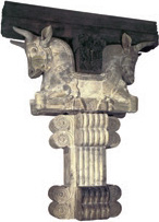 更为独特的是,在大殿内高达18米的木柱上,却装着巨大的石雕柱头。这种柱头绝不同于埃及的花形或几何形的柱头,而是两头背向而跪的公牛,十分具象的形体,公牛下面是覆钟形(图2-049)。这个柱头高5米,已占了整个柱高的四分之一。此外还有双狮柱头、双格里芬柱头(图2-050、图2-051)。这样的台阶浮雕,这样的柱头雕刻,都是没有先例、富有独创性的。