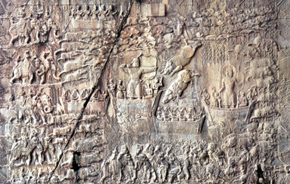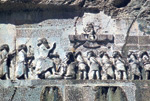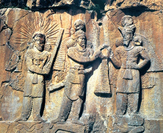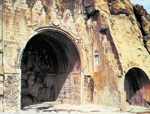 也是在萨珊王朝时期,公元591年~628年间,在靠近两河流域的塔基博斯坦的一个巨大岩洞内,留下了十分精彩的大型浮雕。(此时,印度已是笈多王朝,戒日王的统治再现了帝国的盛况,阿旃陀石窟正显辉煌。中国的敦煌、大同等地的石窟也正在蓬勃发展。